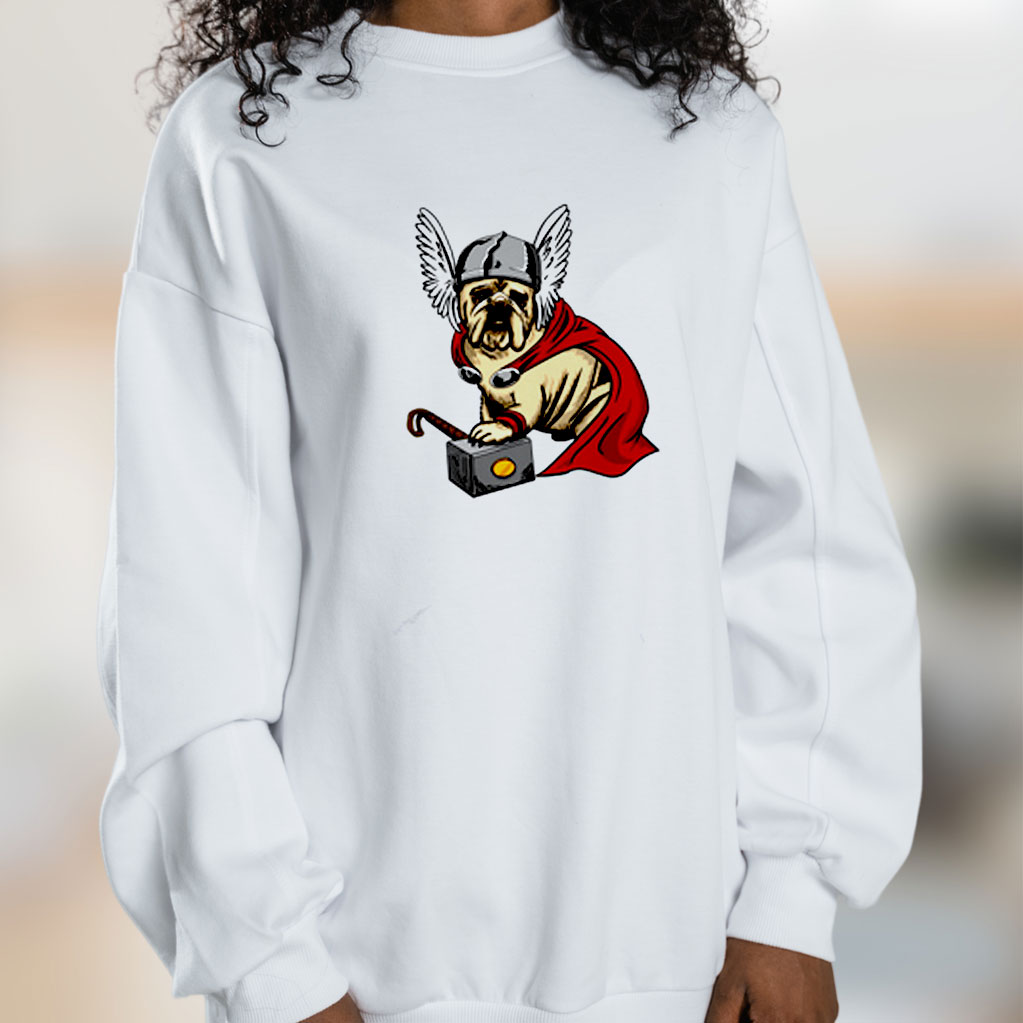 The Mighty Bulldog Thor Graphic Sweatshirt, made to order and screen printing by hand and are high-quality prints available in all sizes.